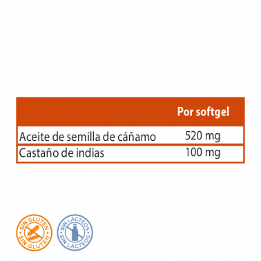 Hemp seed oil (Cannabis sativa L.) cold pressed*, casing (gelatin), dry extract of horse chestnut (Aesculus hippocastanum L.) standardized to 20% escin, humectant (vegetable glycerin), emulsifier (sunflower lecithin), water, thickener (beeswax), antioxidant (D-a-tocopherol), colorants (iron oxides black and red).