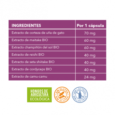 Bulking agent (cellulose), gastroresistant plant casing (hydroxypropyl methylcellulose), dry extract of cat's claw bark (Uncaria tomentosa (Willd)) standardised to 0.3% oxindole derivatives 70 mg, dry extract of maitake* (Grifola frondosa) standardised to 30% polysaccharides 60 mg, dry extract of sun mushroom* (Agaricus blazei Murill) standardised to 15% beta-glucans 60 mg, carrier (shellac), dry extract of reishi* (Ganoderma lucidum) standardised to 30% polysaccharides (20% beta-glucans) and 5% triterpenes (as ganoderic acid) 40 mg, dry extract of cordyceps* (Cordyceps sinensis) standardised to 30% polysaccharides, 0.3% cordycepin and 1% adenosine 40 mg, dry extract of shiitake mushroom* (Lentinula edodes) standardised to 15% beta-glucans 40 mg, camu-camu extract (Myrciaria dubia) standardised to 50% vitamin C 24 mg, sweetener (xylitol).