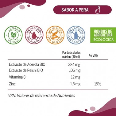 Purified water, agave syrup*, dry extract of Acerola berries* (Malpighia glabra L.) standardised to 17% Vitamin C, 25:1 dry extract of Reishi* (Ganoderma lucidum), pear flavouring (Pyrus communis L.), preservative (potassium sorbate), ascorbic acid, zinc gluconate**.