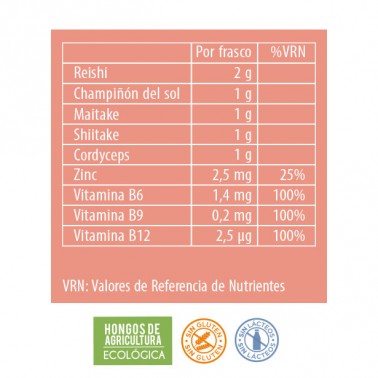 Agave nectar*, purified water, dry extract of reishi* (Ganoderma lucidum) standardised to 30% polysaccharides, 20% beta-glucans, 4% triterpenes and 1% ganoderic acid, dry extract of sun mushroom* (Agaricus blazei Murill) standardised to 40% polysaccharides and 20% beta-glucans, dry extract of maitake* (Grifola frondosa) standardised to 30% polysaccharides and 20% beta-glucans, dry extract of shiitake mushroom* (Lentinula edodes) standardised to 40% polysaccharides and 20% beta-glucans, dry extract of cordyceps* (Cordyceps sp) standardised to 30% polysaccharides, 20% beta-glucans, 1% adenosine and 0.3% cordycepin, preservatives (potassium sorbate, sodium benzoate), acidulants (citric acid, malic acid), flavouring agents (citric acid, malic acid), flavouring and preservatives, malic acid), flavourings (biscuit flavour, lemon essential oil), zinc sulphate, sweetener (steviol glycosides*), flavouring (natural flavouring), pyridoxine HCl, folic acid, cyanocobalamin.