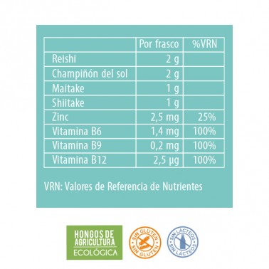 Agave nectar*, purified water, dried extract of reishi* (Ganoderma lucidum) standardised to 30% polysaccharides, 20% beta-glucans, 4% triterpenes and 1% ganoderic acid, dried extract of sun mushroom* (Agaricus blazei Murill) standardised to 40% polysaccharides and 20% beta-glucans, dry extract of maitake* (Grifola frondosa) standardised to 30% polysaccharides and 20% beta-glucans, dry extract of shiitake mushroom* (Lentinula edodes) standardised to 40% polysaccharides and 20% beta-glucans, preservatives (potassium sorbate, sodium benzoate), acidulants (citric acid, malic acid), flavourings (biscuit flavouring, lemon essential oil), zinc sulphate, sweetener (steviol glycosides*), flavouring (natural flavouring), pyridoxine HCl, folic acid, cyanocobalamin.