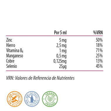 Purified water, sweetener (sucrose), zinc gluconate, iron gluconate, preservative (potassium sorbate), flavouring (mandarin flavouring), manganese gluconate, acidifier (citric acid), pyridoxine HCl, copper gluconate, sodium selenite.