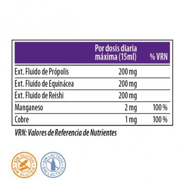 Purified water, fresh fruit syrup, orange juice concentrate, Propolis fluid extract, Echinacea fluid extract (Echinacea purpurea (L) Moench), Reishi fluid extract (Ganoderma lucidum (Leyss. Fr.) Karst.), antioxidant (vitamin C), orange flavouring, thickener (xanthan gum), manganese gluconate, preservatives (sodium benzoate and potassium sorbate) and copper gluconate.