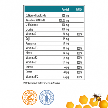 Purified water, fructose, hydrolysed collagen, freeze-dried royal jelly, L-glutamine, L-lysine, L-ascorbic acid, goji juice (Lycium barbarum L. ), iron bisglycinate, dried fenugreek seed extract (Trigonella foenum-graecum L.), preservative (potassium sorbate), niacin, riboflavin, thiamine, chromium picolinate, sodium selenite, cyanocobalamin.