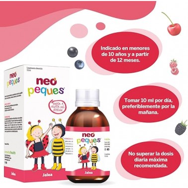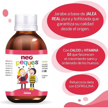 Neo Peques Jalea is a children's syrup made from royal jelly, strengthened by the specific contribution of nutrients such as spirulina, calcium and vitamin D3, which promotes growth, reinforces the diet, contributes to normal growth and development of bones and also gives them energy.