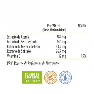 Purified water, agave syrup*, dried extract of acerola berries* (Malpighia glabra L.) standardised to 17% vitamin C, dried extract of thistle mushroom* (Pleurotus eryngii), stabiliser (microcrystalline cellulose), preservative (potassium sorbate), dried extract of lion's mane* (Hericium erinaceus), dried extract of shiitake mushroom* (Lentinula edodes), ascorbic acid.