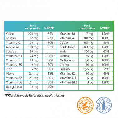 Tricalcium phosphate, bulking agent (microcrystalline cellulose), magnesium oxide, vitamin C, dried extract of bacopa, iron pyrophosphate, anti-caking agent (magnesium stearate), vitamin B3, anti-caking agent vitamin E, (silicon dioxide), vitamin K2, vitamin B5, manganese sulphate, vitamin A, zinc sulphate, vitamin B12, vitamin B6, vitamin B2, vitamin D3, vitamin B1, sodium molybdate, copper sulphate, chromium picolinate, folic acid, potassium iodide, biotin, sodium selenite.