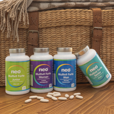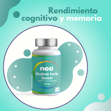 MULTIVIT FORTE SENIOR NEO is a food supplement with Bacopa, a useful plant extract traditionally used to strengthen the nervous system and memory. It has neuroprotective activity, increasing the survival of cells damaged by β-amyloid (Aβ) peptide and the mitochondrial dysfunction it causes. It is also an antioxidant, increasing the release of glutathione-s-transferase, superoxide dismutase and catalase, thus neutralising oxidative damage. It also has immunostimulant and cholinergic activity (reducing acetylcholinesterase activity and increasing acetylcholine levels).