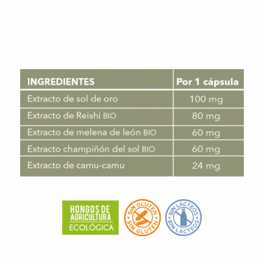 Bulking agent (cellulose), 5:1 dry extract of golden sunflower (Helichrysum italicum (L. ) Moench) 100 mg, gastroresistant plant casing (hydroxypropyl methylcellulose), dry extract of reishi* (Ganoderma lucidum) standardised to 30% polysaccharides (20% beta-glucans) and 5% triterpenes (as ganoderic acid) 80 mg, dry extract of sun mushroom* (Agaricus blazei Murill) standardised to 15% beta-glucans 60 mg, dry extract of lion's mane* (Hericium erinaceus) standardised to 30% polysaccharides 60 mg, carrier (shellac), camu-camu extract (Myrciaria dubia) standardised to 50% vitamin C 24 mg, sweetener (xylitol).