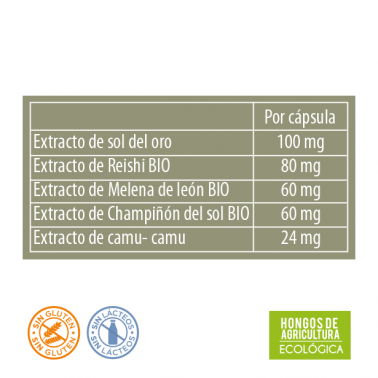Bulking agent (cellulose), golden sun (Helichrysum italicum (L. ) Moench) complete plant extract 5: 1 100 mg, gastroresistant plant casing (hydroxypropyl methylcellulose), dry extract of reishi* (Ganoderma lucidum) standardised to 30% polysaccharides (20% beta-glucans) and 5% triterpenes (as ganoderic acid) 80 mg, extract of lion's mane* (Hericium erinaceus) standardised to 30% polysaccharides 60 mg, dried extract of sun mushroom* (Agaricus blazei Murill) standardised to 15% beta-glucans 60 mg, carrier (shellac), dried extract of camu-camu (Myrciaria dubia) standardised to 50% vitamin C 24 mg, sweetener (xylitol).