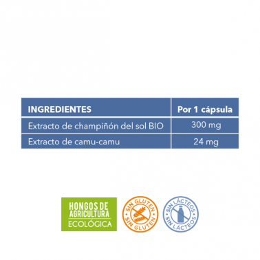 Extracto seco de champiñón del sol* (Agaricus blazei Murill) estandarizado al 15% en betaglucanos 300 mg, agente de carga (celulosa), agente de recubrimiento vegetal (hidroxipropilmetilcelulosa), estabilizante (hidroxipropilmetilcelulosa), extracto de camu-camu (Myrciaria dubia) estandarizado al 50% en vitamina C 24 mg, agente de carga (xilitol).