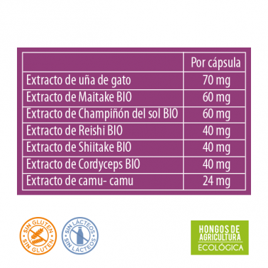 Agente de carga (celulosa), agente de recubrimiento vegetal (hidroxipropilmetilcelulosa), extracto seco de uña de gato (Uncaria tomentosa (Willd) DC.) estandarizado al 0,3% en derivados oxindólicos 70 mg, extracto seco de maitake* (Grifola frondosa) estandarizado al 30% en polisacáridos 60 mg, extracto seco de champiñón del sol* (Agaricus blazei Murill) estandarizado al 15% en betaglucanos 60 mg, estabilizante (hidroxipropilmetilcelulosa), extracto seco de reishi* (Ganoderma lucidum) estandarizado al 30% en polisacáridos (20% betaglucanos) y 5% en triterpenos (como ácido ganodérico) 40mg, extracto seco de shiitake* (Lentinula edodes) estandarizado al 15% en betaglucanos 40 mg, extracto seco de cordyceps* (Cordyceps sinensis) estandarizado al 30% en polisacáridos, al 0,3% en cordicepina y al 1% en adenosina 40 mg, extracto de camu-camu (Myrciaria dubia) estandarizado al 50% en Vitamina C 24 mg, agente de carga (xilitol).