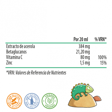 Agua, sirope de frutas frescas, extracto seco de bayas de acerola* (Malpighia glabra L.) estandarizado al 17% en vitamina C, betaglucanos 20% y triterpenos 4% de reishi* (Ganoderma lucidum), ácido ascórbico (vitamina C), conservador (sorbato de potasio), gluconato de zinc.