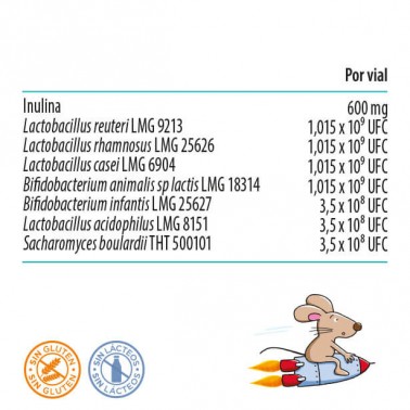 (Lactobacillus reuteri LMG 9213, Lactobacillus rhamnosus LMG 25626, Lactobacillus casei LMG 6904, Bifidobacterium animalis sp lactis LMG 18314, Bifidobacterium infantis LMG 25627, Lactobacillus acidophilus LMG 8151, Sacharomyces boulardii THT 500101), aromatizante (aroma de plátano), acidificante (ácido cítrico), conservante (sorbato potásico), aromatizante (aroma de frutas del bosque), antiagregantes (dióxido de silicio, estearato de magnesio).