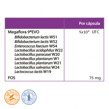 Megaflora 9® EVO (Bifidobacterium lactis W51, Bifidobacterium lactis W52, Enterococcus faecium W54, Lactobacillus acidophilus W22, Lactobacillus paracasei W20, Lactobacillus plantarum W1, Lactobacillus plantarum W21, Lactobacillus salivarius W24, Lactococcus lactis W19), agente de carga (celulosa), agente de recubrimiento (hipromelosa), FOS (fructooligosacáridos), estabilizante (goma laca), agente de carga (xilitol).