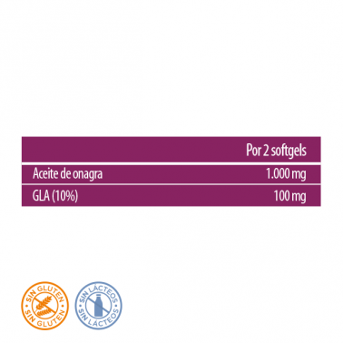 Aceite de Onagra (Oenothera biennis) estandarizado al 10% en GLA, envoltura (gelatina), humectante (glicerina), agua, antioxidante (D-α-tocoferol).
