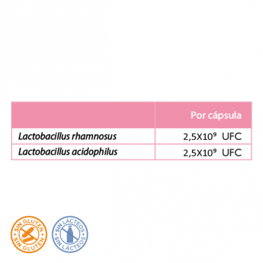 Agente de carga (celulosa), agente de recubrimiento (hipromelosa), VGA-1® (Lactobacillus rhamnosus, Lactobacillus acidophilus), agente de carga (xilitol), estabilizante (hidroxipropilmetilcelulosa).