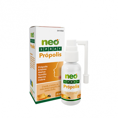 Neo Spray Própolis es un spray natural con efecto balsámico y refrescante, formulado con Própolis, Tomillo, Erísimo, Malva y Cobre, ingredientes de origen vegetal tradicionalmente utilizados para favorecer el bienestar de la garganta y las vías respiratorias.