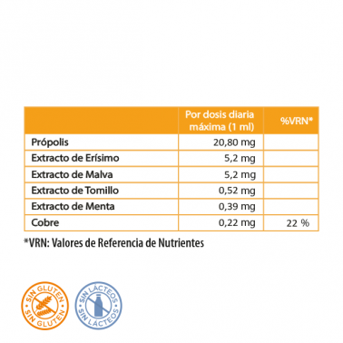 Agua, agente de carga (glicerina), extracto glicerinado de própolis, extracto fluido de erísimo (Sisymbrium officinalis (L.) Scop.), extracto fluido de flores de malva (Malva sylvestris L.), conservador (sorbato potásico), gluconato de cobre, acidulante (ácido cítrico), aceite esencial de tomillo (Thymus vulgaris L.), aceite esencial de menta (Mentha x piperita L.).