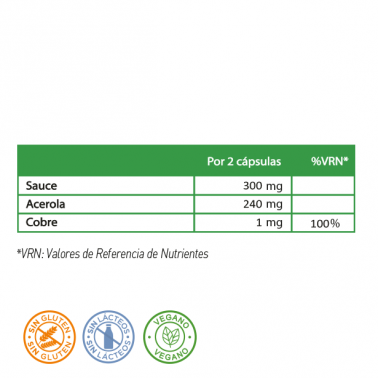 Extracto seco de corteza de Sauce (Salix alba L.) estandarizado al 25% en salicina, agente de carga (celulosa), extracto seco de fruto de Acerola (Malpighia punicifolia L.) estandarizado al 17% en vitamina C, agente de recubrimiento vegetal (hidroxipropilmetilcelulosa), estabilizante (hidroxipropilmetilcelulosa), agente de carga (xilitol), cobre.