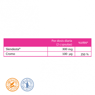 Slendesta® (extrait sec de Solanum tuberosum L., standardisé à 5% PI2), agents de charge (xylitol et mannitol), enveloppe (gélatine), support (gomme-laque), anti-agglomérant (talc), picolinate de chrome.