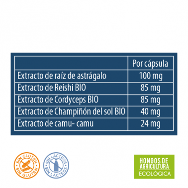 Diluant (cellulose), extrait sec de racine d'astragale (Astragalus membranaceus (Fisch.) 5:1). Bunge)) 100 mg, enveloppe végétale gastrorésistante (hydroxypropyl méthylcellulose), extrait sec de reishi* (Ganoderma lucidum) standardisé à 30% de polysaccharides (20% de bêta-glucanes) et 5% de triterpènes (sous forme d'acide ganodérique) 85 mg, extrait sec de cordyceps* (Cordyceps sinensis) standardisé à 30% de polysaccharides, 0,3% de cordycépine et 1% d'adénosine 85 mg, support (gomme laque), extrait sec de champignon solaire* (Agaricus blazei Murill) standardisé à 15% de bêta-glucanes 40 mg, extrait de camu-camu (Myrciaria dubia) standardisé à 50% de vitamine C 24 mg, édulcorant (xylitol), agent anti-agglomérant (E553).