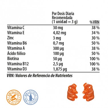 Sucre, sirop de glucose, eau purifiée, gélatine, dextrose, arôme (arôme fraise), humectant (sorbitol), acidifiant (acide citrique), acide L-ascorbique, gluconate de zinc, acétate de DL-α-tocophéryl, colorant naturel (E-120), pyridoxine HCl, acétate de rétinyl, acide folique, biotine, cyanocobalamine, cholécalciférol.