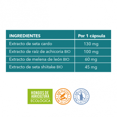 Poudre de champignon chardon* (Pleurotus eryngii) standardisée à 50% de polysaccharides 130 mg, agent de charge (cellulose), extrait sec 4:1 de racine de chicorée (Cichorium intybus L.) ) 100 mg, enveloppe végétale gastrorésistante (hydroxypropyl méthylcellulose), extrait sec de crinière de lion* (Hericium erinaceus) standardisé à 30% de polysaccharides 60 mg, extrait sec de champignon shiitake* (Lentinula edodes) standardisé à 15% de bêta-glucanes 45 mg, support (gomme laque), édulcorant (xylitol).