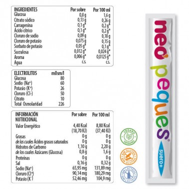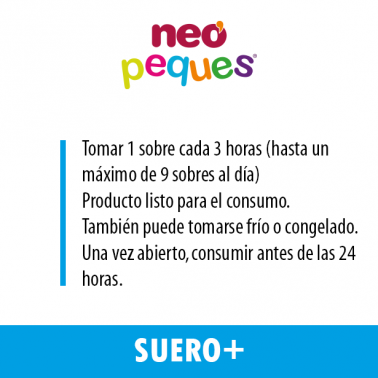 Neo Peques Suero+ est un sérum de réhydratation orale qui convient à tous les âges, y compris aux nourrissons. Aliment à usage médical spécial indiqué pour la gestion diététique de la déshydratation due à la diarrhée ou aux vomissements, avec perte d'électrolytes. Sa présentation en sachets unidoses et sa consistance de gel en font un produit facile à prendre.