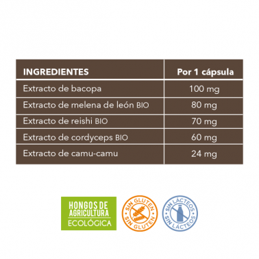 Agent de charge (cellulose), extrait sec de bacopa (Bacopa monnieri) standardisé à 20% de bacosides A-B 100 mg, enveloppe végétale gastrorésistante (hydroxypropyl méthylcellulose), extrait sec de crinière de lion* (Hericium erinaceus) standardisé à 30% de polysaccharides 80 mg, extrait sec de reishi* (Ganoderma lucidum) standardisé à 30% de polysaccharides (20% de bêta-glucanes) et 5% de triterpènes (sous forme d'acide ganodérique) 70 mg, extrait sec de cordyceps* (Cordyceps sinensis) standardisé à 30% de polysaccharides, 0,3% de cordycépine et 1% d'adénosine 60 mg, support (gomme-laque), extrait de camu-camu (Myrciaria dubia) standardisé à 50% de vitamine C 24 mg, édulcorant (xylitol).