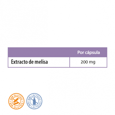Extrait sec de feuilles de mélisse (Melissa officinalis L) standardisé à 2% d'acide rosmarinique 200 mg, agent de charge (cellulose), enveloppe végétale (pululan), support (gomme-laque), édulcorant (xylitol).