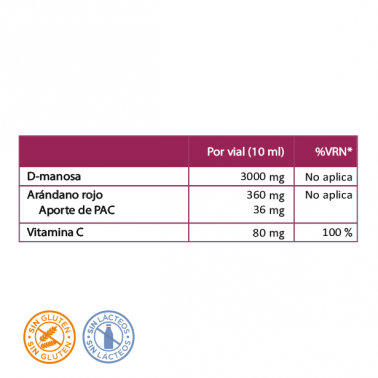 Eau purifiée, D-mannose, extrait sec de canneberge américaine (Vaccinium macrocarpon Ait.) standardisé à 10% de proanthocyanidines (PACs)*, acide ascorbique, conservateur (sorbate de potassium), édulcorant (sucralose).